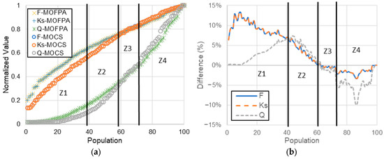 Comparison between MOFPA and MOCS, normalized objective values: (a) Pareto front, (b) difference between optimum values of MOFPA and MOCS. Z1 (fist zone), Z2 (second zone), Z3 (third zone), Z4 (fourth zone).