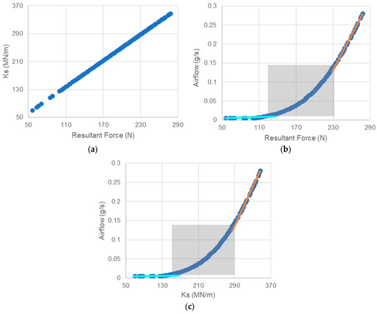 Pareto front of PGJB (a) resultant force vs. static stiffness coefficient, (b) resultant force vs. airflow, linear region of high (cyan line) and low (orange line) ratio between the resultant force and the airflow and non-linear zone (shaded zone) and (c) static stiffness coefficient vs. airflow, linear region of high (cyan line) and low (orange line) ratio between the static stiffness coefficient and the airflow and non-linear zone (shaded zone).