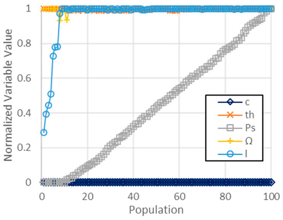 The normalized values of the variables obtained by the optimization process are presented in Figure 15. The first elements of the population show that the optimum objective values are guided for the length of the porous gas bearing; as the length increases, the performance is optimized. At the same time, the clearance and the supply pressure are at the lower boundary of the range, and the thickness and rotational speed are at the upper boundary of the range. The supply pressure guides the rest of the optimum objective values in the Pareto front; the performance is optimized as the supply pressure increases. In this case, the clearance is in the lower boundary of the range, and the thickness, rotational speed, and length are in the upper boundary of the range. Taking the shaded zone from Figure 14b and translating it to Figure 15, the optimized pressure range is from 3.5 to 8 bars. The optimization process can be repeated by selecting a value in the optimized pressure range to determine the range for optimizing the following variable.