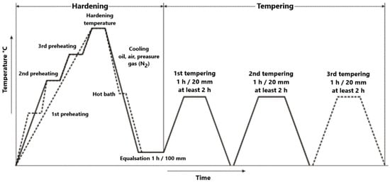 The general heat treatment process used for tool steels is shown in Figure 1. It consists of two main phases: hardening and tempering. Hardening involves three-stage preheating (1st, 2nd, and 3rd preheating), followed by reaching the quenching temperature and rapid cooling in oil, air, or nitrogen. Before the actual hardening, equalization is carried out to ensure a homogeneous microstructure of the material. Tempering is carried out in three cycles (1st, 2nd, and 3rd tempering), each generally lasting 1 h per 20 mm of material thickness. This process eliminates internal stresses and optimizes the mechanical properties of the steel. Heat treatment significantly affects the cutting performance and overall usability of tool steels, allowing precise control of their resulting mechanical properties [18].