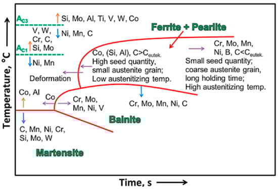 The composition of alloying elements in steels influences the overall mechanism and kinetics of phase transitions. As the carbon concentration rises, the locations of the Ms and Mf temperatures decrease. For steel with a carbon content greater than 0.3%, the Mf temperature falls below 0 °C. Most alloying elements that are soluble in ferrite (except for Co and Al) extend the austenite decomposition curves, resulting in longer transformation times. Furthermore, carbide-forming elements like Cr, Mo, W, and V significantly differentiate the pearlitic and bainitic transformation regions, giving rise to the characteristic “two noses” on the transformation curve. Elements such as Mn, Si, Al, Cu, and Ni tend to prolong the duration of austenite decay. In general, alloying elements, apart from Al and Co, reduce the Ms temperature while enhancing the volume fraction of retained austenite. As the proportion of carbon in steel increases, the influence of additives will be even more pronounced. Also, the incorporation of thermomechanical processing can significantly shift the region of occurrence of the onset of ferritic transformation toward faster cooling times. In addition, carbide-forming elements (Cr, W, V, and Mo) significantly change the shape of the diagram; they separate the pearlitic and bainitic stages of transformation. At the interface of these transformations, the decay slows down, and at the same time, the stability of undercooled austenite increases [21,22,23,24]. A general view of the influence of these alloying elements on the resulting shape of the CCT diagram is shown in Figure 2.