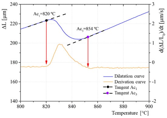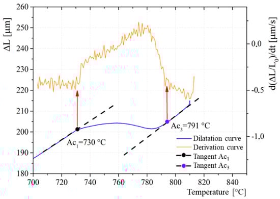Figure 4 shows a selected heating curve on which the beginning and end of the austenitization temperatures Ac1 and Ac3 are shown using tangent lines. The initial temperature of austenitization, Ac1, started at a temperature of 820 °C, and the end of austenitization, Ac3, occurred at a temperature of 854 °C. These values are also confirmed by the derivation of the given dilatation curve, on which these temperatures can be read more accurately.