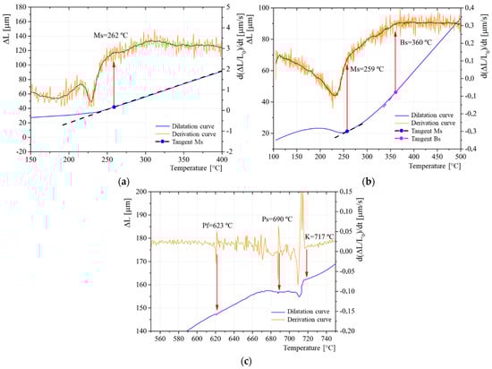 Figure 5a shows the expansion curve at the highest cooling rate of 10 °C/s. From the expansion curve, the initial temperature of Ms was determined using a tangent line at the value of 262 °C. This temperature is also confirmed by the derivative curve of the given expansion curve. The authors of [32] state that this decrease at higher temperatures represents martensite, which begins to form inside the austenite grain and not from its boundaries.