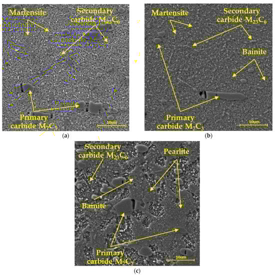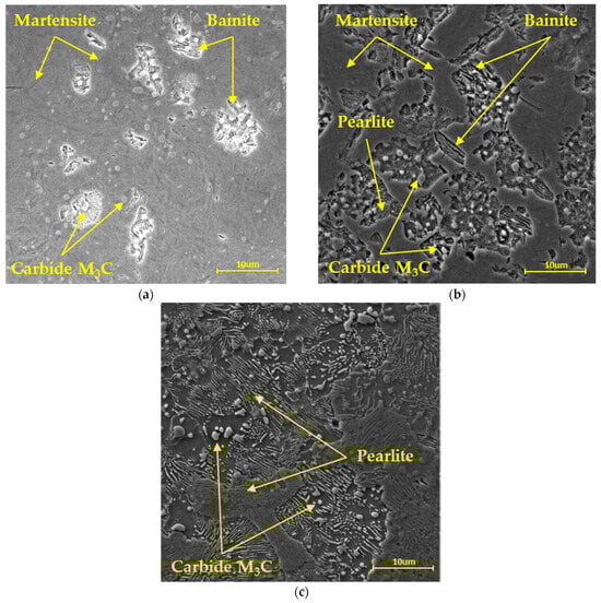 Microstructure of X153CrMoV12 steel; (a) SEM 10 °C/s; (b) SEM 1 °C/s; (c) SEM 0.1 °C/s.