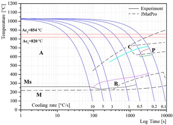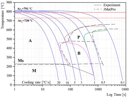 CCT diagram of 100MnCrW4 steel: A—austenite; B—bainite; M—martensite; Ms—martensite start; P—pearlite.