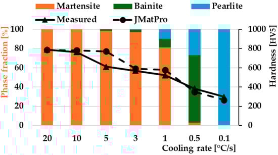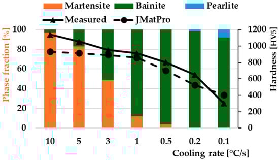 Comparison of HV5 hardness values and simulated phase fractions for different cooling rates of 100MnCrW4 steel.
