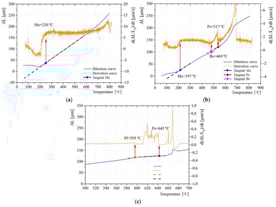 Figure 5 presents selected measured experimental expansion curves as a function of the cooling rate. As is known, the decomposition of austenite and the formation of new phases depends on the cooling rate. This course of austenite decomposition during continuous cooling corresponds to the slope discontinuity found in the dilatometric curves and is related to the temperature range of the formation of a specific type of microstructure. Although the temperature ranges in which different phase transformations can occur in steel are quite wide and may even overlap, it was possible to detect every phase transformation that occurred during the overall continuous cooling process.