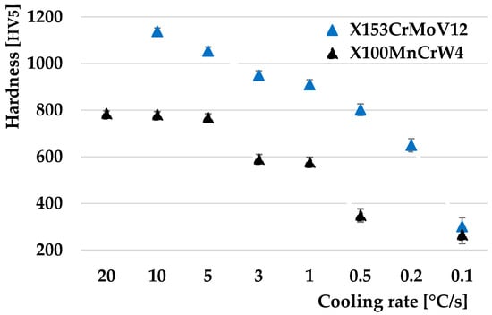 Comparison of measured hardness values at different cooling rates of steel X153CrMoV12 and 100MnCrW4.