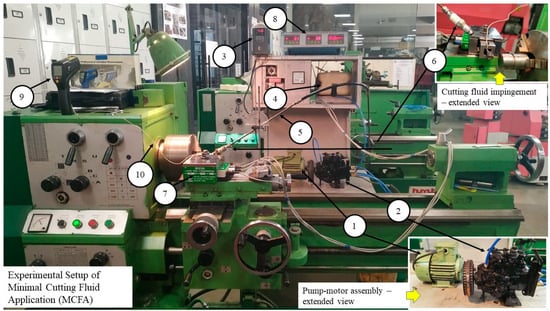 Experimental setup of minimal cutting fluid application (Mane et al., 2020) [27]. (1) AC Motor, (2) Fluid Pump, (3) Variable Frequency Device, (4) Cutting Fluid Tank, (5) Cutting Fluid High-Pressure Line, (6) Nozzle, (7) Dynamometer, (8) Digital Display unit, (9) Infrared Thermometer, (10) Thermocouple Cable.