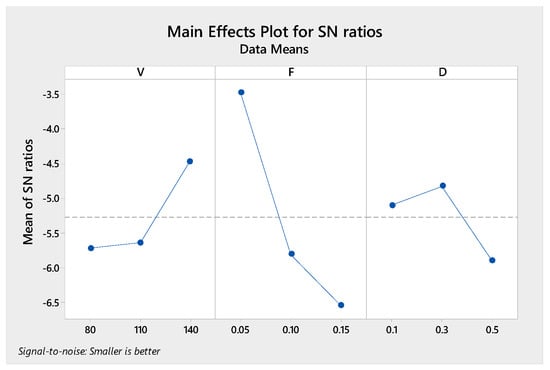 Additionally, the response table enabled the construction of a main effects plot for the S/N ratio. The maximum value of each parameter in the S/N plot identified the optimal settings for minimizing Ra, Rt, and Rz, which included a cutting speed of 140 m/min, a feed rate of 0.05 mm/rev, and a depth of cut of 0.3 mm, as shown in Figure 2.