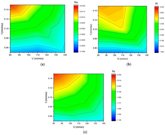 Contour plot of (a) Ra, (b) Rt, and (c) Rz for cutting speed vs. feed rate.
