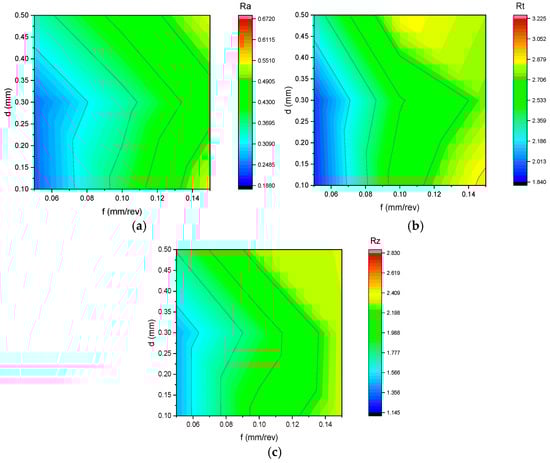 Contour plot of (a) Ra, (b) Rt, and (c) Rz for depth of cut vs. feed rate.
