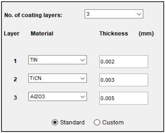The WC-Co sintered carbide tool coated with three layers (TiN/TiCN/Al2O3) of coating was modelled as a rigid body, constrained to move only in the cutting direction at the prescribed cutting parameters. Tool coating within AdvantEdge was applied using a thin layer of an explicitly meshed coating. Three layers of coating (Al2O3: 5 µm, TiCN: 3 µm, and TiN: 2 µm) were selected. The 2 µm TiN layer was considered the inner-most layer, and each additional layer fell outside the previous. A tetrahedral-type mesh was used for the meshing process. A total of 24,000 nodes were applied for the mesh generation, with a mesh grade of 0.4 and element sizes of 0.05 mm and 0.01 mm, respectively. Figure 3 depicts the tool coating parameters.