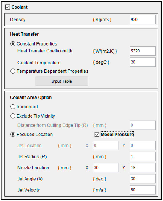 The focused coolant model pressure function of coolant modelling within AdvantEdge was used to simulate the effects of coolant and its jet application parameters in machining processes. Minimal jet cooling was represented by adopting the appropriate cutting fluid’s heat transfer coefficient as AdvantEdge software permits only the user to change the cutting fluid’s jet velocity to modify the cooling conditions. Banerjee et al., 2014 [12] developed a friction model using AdvantEdge software, when machining AISI 1045 steel under minimum quantity lubrication with a heat transfer coefficient value of 250 W/m2·K and wet cooling with a heat transfer coefficient value of 5230 W/m2·K. Liu et al., 2020 [29] developed a simulation model of AdvantEdge FEM to predict the cutting force under a high-pressure cooling environment with a convective heat transfer coefficient value of 10,000 W/m2·K. Feng et al., 2024 [38] conducted a simulation of spray cooling in the turning of GH4169 with a heat transfer coefficient value of 2644.8 W/m2·K, and a jet velocity of 6.14 m/s The convective heat transfer coefficient typically ranges from 2500 to 5500 W/m2·K for the coolant jet velocities in the range of 50–70 m/s. In the present study, a convective heat transfer coefficient of 5320 W/m2·K was selected and the initial coolant temperature was considered to correspond to the room temperature. With the focused coolant model pressure function of coolant modelling, the effects of coolant application parameters were studied. Coolant flow was assumed to be uniform and steady after leaving the nozzle. For a specific nozzle stand-off distance, the nozzle location was determined based on the reference position and angle of impingement. The cutting fluid’s flow velocity at various pressures was determined using Equation (12) [44].