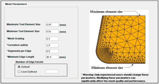 Figure 6 presents a mesh parameter for the cutting tool, with the maximum and minimum element sizes defined as 0.05 mm and 0.01 mm, respectively. Mesh grading, curvature safety, and segments per edge were set to 0.4, 1.5, and 6, respectively. The minimum edge length was specified as 0.24 mm. Larger elements were assigned to simple areas, while finer elements were applied to detailed regions, ensuring accuracy and efficiency.