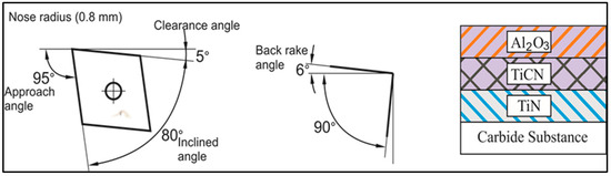 Coated carbide tools offer an economical alternative to CBN/PCBN and ceramic tools. Hard turning tests were conducted using HK 150 grade multilayer coated carbide inserts mounted on a PCLNR2020 K12 type right-hand tool holder. Figure 7 shows the geometry of the cutting inserts and the coating layer with a carbide substrate.