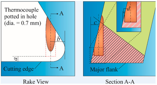 The copper guard was fixed over the thermocouple with metal adhesive to protect the thermocouple from forming chips during machining. The dimensions a, b, c, and d indicate the thermocouple’s hole positioning within the insert, ensuring precise temperature monitoring while maintaining tool integrity. “a” denotes the horizontal distance from the cutting edge along the rake face, optimising temperature sensitivity and thermocouple safety. “b” represents a fixed hole depth oriented perpendicular to the rake surface, influencing thermocouple stability and response time. “c” represents the distance from the hole centre to the principal flank face, facilitating positioning modifications without compromising the tool’s integrity. “d” is the minimal residual material thickness between the hole and the principal flank face, maintained at 0.15 mm to ensure structural integrity and measurement precision. Overall, these characteristics enhance thermocouple positioning for reliable thermal monitoring. Table 5 shows the blind hole dimensions on the inserts.