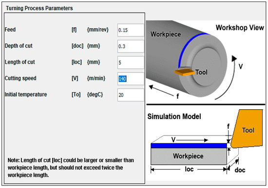 The FEM-based commercial software “AdvantEdge” was used to predict the thermal effects occurring during hard turning with a coated carbide tool insert under a minimal cutting fluid environment. AdvantEdge is an explicit dynamic Lagrangian code that can perform a conjugate thermomechanical transient analysis. The program uses an adaptive meshing and a continuous meshing for chips and workpieces, which ensure accurate results. It has an extensive database of workpieces and tool materials that are typically used in cutting operations and provides all the data necessary for efficient material modelling. The workpiece material, cutting tools, and process settings were modelled from the software menu and data library. Figure 1 depicts the range of inputs and outputs related to the AdvantEdge machining software. Inputs include comprehensive specifications for the cutting tool, workpiece, and process parameters. The advanced options for mesh grading and element sizing facilitate customisation. Outputs include the essential aspects of machining such as cutting forces, cutting temperature, plastic strain, maximum shear stress, and residual stress. This extensive framework allows the accurate simulation and analysis of machining operations to enhance performance and material behaviour.