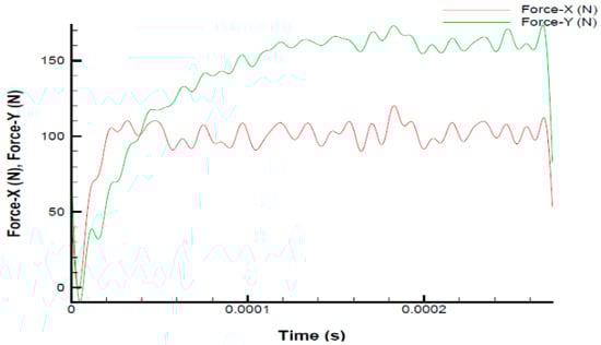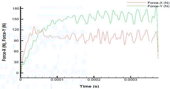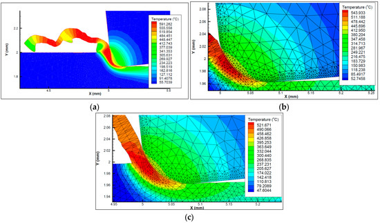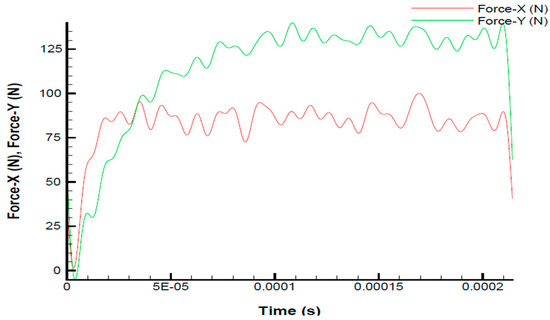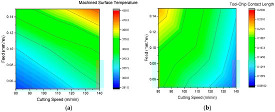 The simulation results can be significantly influenced by the friction coefficient between the tool and the workpiece. AdvantEdge simulation software adopts the classical sliding friction approach to simulate the friction that occurs at the contact point between the tool and the chip. The concept is founded on the principle that the force of frictional sliding is directly proportional to the normal load. The relationship between these forces is defined by the coefficient of friction (), which is considered a constant value during contact between the tool and the chip. This model considers the combined length of the adhesive and sliding areas as the tool–chip contact length. The Coulomb friction model is represented by Equation (8) [42].