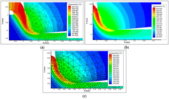 The material model is a crucial aspect of a finite element simulation, significantly influencing the accuracy of the results. To ensure precise simulations, the power law material model was selected to conduct the simulation [41]. The power law comprises a strain-hardening function, denoted as g, and a thermal-softening function, denoted as . The strain rate sensitivity function is represented as . The material’s constitutive model governed by the power law is illustrated in Equation (1) [42]: