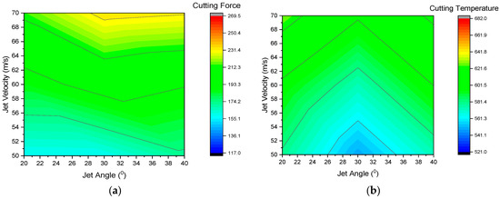 Figure 4 shows a simulation interface designed for a thermal-fluid analysis in machining, focusing on the heat transfer and optimisation of coolant parameters. The heat transfer module supported modelling with constant or temperature-dependent properties, employing a fixed heat transfer coefficient of 5320 W/m2·K, and a coolant temperature of 20 °C to simulate ambient cooling. The “Focused Location” configuration enabled precise coolant targeting, integrating parameters like jet coordinates, nozzle positioning, nozzle angle, and jet velocity. The activation of the “Model Pressure” feature incorporated coolant pressure effects, ensuring a comprehensive representation of localized thermal interactions crucial for tool integrity and efficiency in high-speed machining. Modelling simulations were performed under identical experimental cutting conditions and accordingly, the results obtained were analysed.