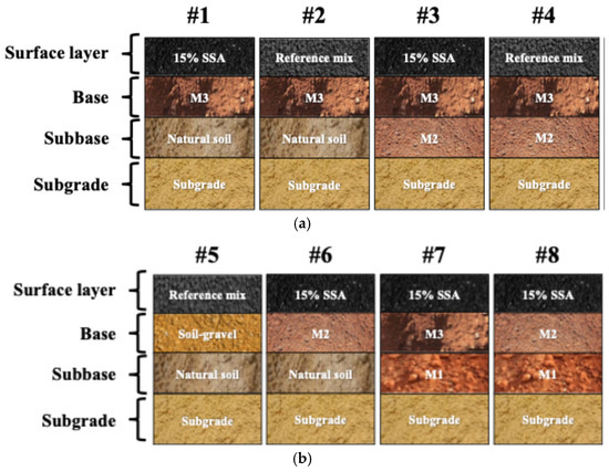 For the configuration of the pavement structures evaluated, similar to typical structures in Brazil, soil–aggregate mixtures with higher steel slag content were chosen for the base layer in comparison to the mixtures used for the subbase layer. For the surface layer, asphalt concrete with 15% steel slag aggregate was used for structures #1, #3, #6, #7, and #8 (Figure 2). However, aiming to identify the influence of BSSF steel slag content on the performance of the layers executed with these mixtures, structure #5 was designed with materials traditionally employed in the field.