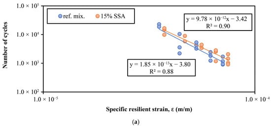 The fatigue coefficients were obtained through the diametral compression fatigue test of the asphalt mixture, with 15% SSA used in the eight simulations. Figure 3a illustrates the corresponding fatigue curve and the fitting coefficients, which are used as input in the pavement design software. As expected, with the increase in stiffness observed in the MR test and the incorporation of SSA, there is an increase in the fatigue resistance of the asphalt mixtures. A higher RM provides greater stiffness to the asphalt layer, resulting in smaller elastic deformations under traffic loads. Consequently, there is a reduction in the propagation of fatigue cracks. However, excessive stiffness can be detrimental to surface layers. Nevertheless, the 10.3% increase in RM of the asphalt mixture with steel slag aggregate (SSA) appears to be favorable and within the balance range between stiffness and flexibility. The increase in RM of the SSA mixture compared to the reference mixture’s RM may have also contributed to reduced accumulated deformations, as fatigue is associated with microcracks or microdeformations that, over time and under repeated loading cycles, lead to larger cracked areas.