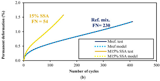 The uniaxial repeated load test for permanent deformation was performed on two specimens of each asphalt mixture and provided FN values as indicated in Figure 3b. It is important to note that FN considerably decreased when the SSA slag was incorporated into the mixture. The stiffness identified by the RM test would indicate a better resistance to this mixture, contrary to what the results show. Such phenomenon might be related to the high percentage of the byproduct in the mixture. That percentage can indicate a higher modification on aggregate resistance. Also, the percentage of binder used in the asphalt mixtures might influence the results. Industrial aggregates tend to absorb and interact with the binder in a different proportion. For these mixtures, the asphalt binder content was the same (4.4%).