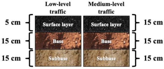 For the scenarios analyzed, the software suggested a specific design, determining the thickness for each pavement layer considering the materials’ characteristics, as shown in Figure 4. To standardize the layers for each scenario, the same structure for the eight simulations on both traffic volumes was considered. For fatigue and stiffness test results, the software suggested an increase in the surface layer thickness with the increase in the traffic volume.
