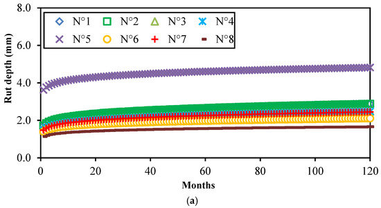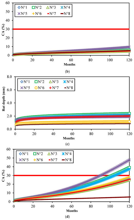 For the low-level traffic (1 × 106), all the simulated structures presented %CA values below the limit (30%) for 10 years (Figure 5b). However, for the medium-level traffic (1 × 107), structures #2, #4, and #5 exceeded the allowed %CA limit, reaching 39.10, 37.43, and 47.81%, respectively, all with a conventional surface layer. This limit was exceeded around 80 months, or 6.5 years, of the pavement’s life. This discrepancy highlights the advantage of SSA as a long-term mitigator of cracked area in pavement. In scenario #5, the surface layer and the other layers do not use steel slag, and this scenario exhibited the highest value of %CA for medium traffic. To delay this pathology, it is recommended to use high-quality materials with greater resistance to permanent deformation and representative resilient modulus. This is especially crucial for the surface layer, as it plays a fundamental role in cushioning and distributing the stresses caused by traffic as well as the effects of climatic and temperature variations. Figure 5d shows the results for %CA for medium-level traffic volume, where this pattern is also observed.