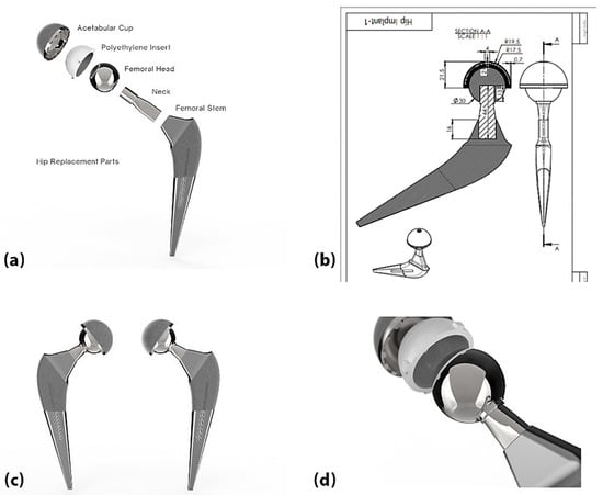 - Trentadue, B.; Ceddia, M.; Callea, C. Design and optimization of an artificial hip joint by finite element analysis. Biomed. J. Sci. Tech. Res. 2023, 48, 39132–39140. [Google Scholar]