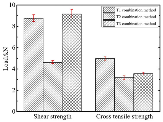 The shear and cross-tensile tests in this study were conducted in accordance with ASTM E8/E8M standards. All joint specimens were tested on a universal testing machine (CMT4304) at a tensile speed of 10 mm/min. The strength of joints under shear and cross-tensile conditions for different sheet layer combinations is shown in Figure 3. As can be seen from the figure, under shear conditions, the strength of T3 joints was the highest, reaching 9.16 kN; T1 joints had the next highest strength at 8.76 kN; and T2 joints had the lowest strength at 4.62 kN. Under cross-tensile conditions, T2 joints had the lowest strength at 3.19 kN; T1 joints had the highest strength at 4.97 kN; and T3 joints had an intermediate strength at 3.56 kN.