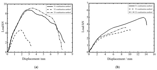 Load–displacement curves of joints with different sheet layer combination modes. (a) Shearing conditions and (b) cross-stretching conditions.