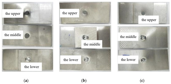 Figure 5 illustrates the failure modes of joints with different sheet layer combinations under shear conditions. For the T1 joint, the failure mode involves the upper sheet being pulled out from the rivet, while the rivet maintains the connection between the middle and lower sheets, as shown in Figure 5a. For the T2 joint, the failure mode is characterized by the rivet being pulled out from the lower sheet, as shown in Figure 5b. Additionally, there are scratches at the riveting location on the lower plate due to the pulling-out action, while the rivet does not fully detach from the upper and middle sheets. The failure mode of the T3 joint is identical to that of the T2 joint, as shown in Figure 5c, with more pronounced scratches at the riveting location on the lower plate.