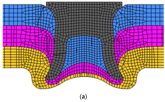 To better understand how different sheet layer combinations affect joint mechanical properties and to analyze the differences among these joints, this study uses the finite element software Hyper Mesh/LS-DYNA (R14.1). Detailed finite element models for various sheet layer combinations are created. Numerical simulations are then conducted to examine the failure processes of joints under both shear and cross-tensile conditions. These analyses help clarify the impact of different sheet layer combinations on joint performance. First, based on the dimensions of the joint forming results, as shown in Figure 7, the rivet and sheets are subjected to rotation treatment to generate the three-dimensional solid model of the joint. A geometric model of the test specimen is also established, comprising four components: the rivet, the upper sheet, the middle sheet, and the lower sheet. Next, a meshing process is performed on the model components. The areas where the rivet and sheets are joined are refined with a solid mesh of 0.25 mm, while the remaining parts of the sheets are coarsely meshed with a solid mesh of 1 mm. Material properties are assigned, and a multilinear elastic–plastic material model is employed. The detailed finite element model of the joint is shown in Figure 8. Subsequently, model parameters are set, defining automatic face-to-face contact between model components with a friction coefficient of 0.2. Additional controls, such as solid element control, contact control, hourglass control, and Arbitrary Lagrangian-Eulerian (ALE)control, are implemented. Finally, loading and boundary conditions are defined. The LS-DYNA solver (ANSYS, San Jose, CA, USA) is used to analyze and obtain the failure processes of joints with different sheet layer combinations under the two working conditions.