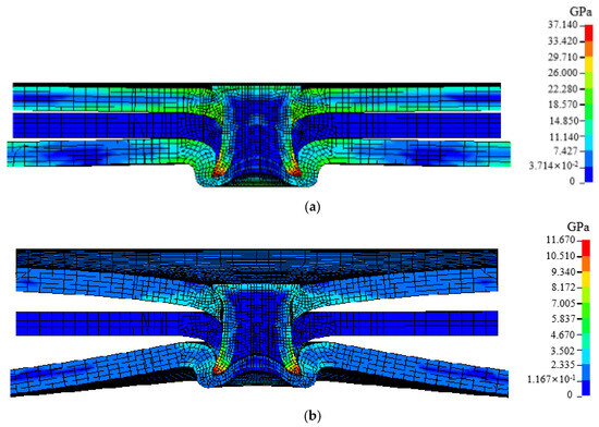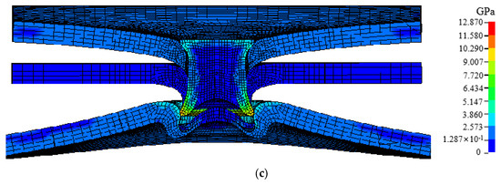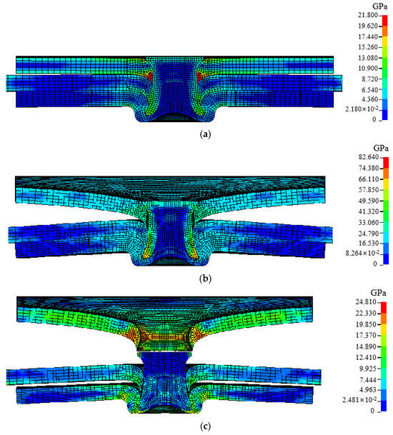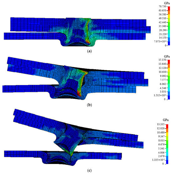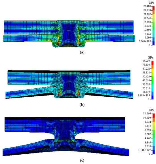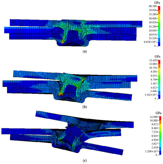 The cross-tensile strength of the T1 plate layer combination joint is the largest, and its failure process under cross-tensile conditions is shown in Figure 10. At the beginning, the self-locking part of the upper plate and the rivet forms maximum stress under the squeeze of the rivet and the middle plate, and the stress concentration of the rivet occurs due to the self-locking of the rivet. As the tensile force increases, the upper plate undergoes plastic deformation, the stress disperses around the punching hole of the sheet, and there is a tendency to expand at the punching hole. Under the combined action of mid-plate stretching and self-locking restrictions, the middle and lower plates are stress concentrated on the contact part of the rivet’s legs, while the rivets form the maximum stress at the tip of the leg. Under the continuous action of tensile force, the plastic deformation at the punching hole of the upper plate continues to increase. When the punching hole expands to greater than the diameter of the rivet head, the upper plate is instantly pulled out of the rivet, causing the joint failure.