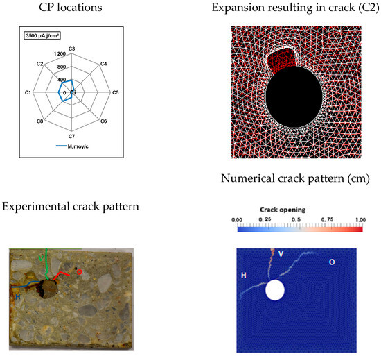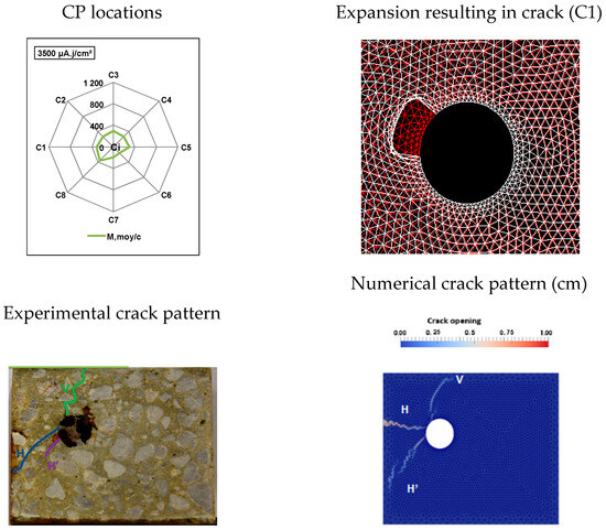 - Crack patterns varied depending on the location of CP expansion. However, they did not systematically develop in front of the initial stress concentration zones or in front of CP expansion zones when there was expansion in a single area. The expansion of two or more areas led to the formation of cracks across both dials and at the shear points due to the expansion.
