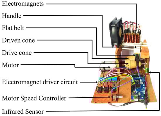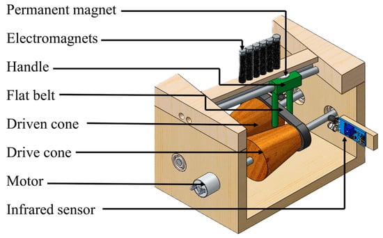 The following sections describe the detailed architecture and design parameters of the mechanical and control subsystems. The mechanical and control subsystem designs were simulated using COMSOL Multiphysics 5.1 [35] and QuickField 6.3 SP2 [36]. The acquired simulation results revealed the magnetic field distribution, flux density, and force interaction between the electromagnet and permanent magnet components. These determine key coil dimensions, select magnet grades, and optimize actuation force levels required for reliable belt displacement.