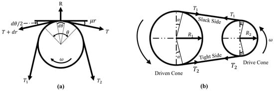 The relative motion between the belt and the cone is maintained through frictional coupling, and system performance depends on optimizing the contact angle, material properties, and surface pressures. The torque applied to the primary (drive) cone is expressed in Equation (1).