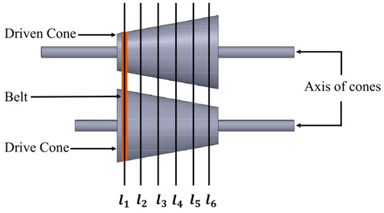 The position of belts along the cone (denoted l1 to l6) is controlled via stepwise actuation (Figure 5), allowing for discrete gear ratio transitions. This approach provides reliable control in systems where continuous variation is mechanically limited.