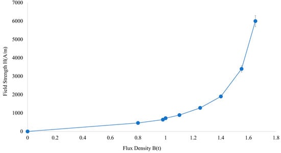 To design the magnetic actuation system, simulations were conducted using COMSOL Multiphysics and QuickField. The simulations were performed to analyze the force interactions between the permanent magnet and electromagnets, which are critical for the performance of the magnetic control unit. Specifically, the simulations evaluated magnetic field distribution, material responses, and force output under defined operating conditions. The simulation model incorporated three material types, steel, copper, and air, which were chosen based on their roles in the system: steel served as the magnetic core, copper as the winding material for the electromagnets, and air as the surrounding medium. Material properties, such as relative permeability and current density, were assigned accordingly. Copper was modeled with unit permeability, while the steel core was defined with nonlinear magnetic behavior to accurately capture magnetic saturation effects. The simulated relationship between magnetic field strength (H) and magnetic flux density (B) for steel is emphasized in Figure 8.