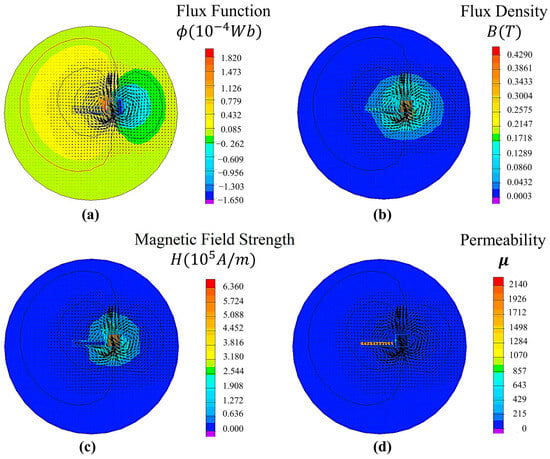 Simulation results showing the distribution of magnetic properties within the electromagnet and permanent magnet structure: (a) magnetic flux function distribution; (b) magnetic flux density distribution; (c) magnetic field strength across the electromagnet; (d) magnetic permeability distribution.