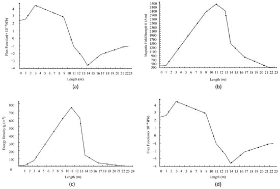 Graphical illustration of simulated magnetic properties as a function of distance: (a) magnetic flux function vs. length; (b) magnetic field strength vs. length; (c) magnetic energy density vs. length; (d) magnetic flux density vs. length.