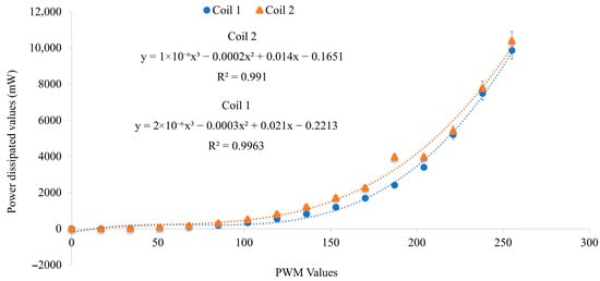 Experimental results showing the relationship between power dissipation and pulse width modulation (PWM) signal duty cycle in a single coil (n = 10).