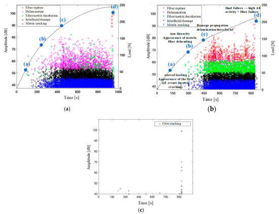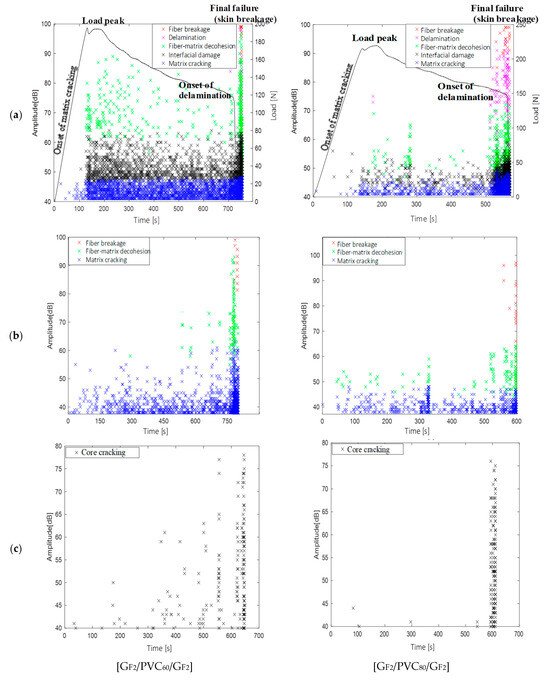 This paper presents the mechanical characterisation of sandwich composites. Different specimen configurations have been tested with a three-point bending load and their mechanical behavior has been discussed. In addition, the acoustic emission technique was used to detect the onset of damage mechanisms and to monitor their evolution. The proposed analysis is based on processing recorded acoustic emission bursts. An unsupervised classification approach, combining the k-means algorithm with Principal Component Analysis (PCA), is used to group the detected acoustic events. The cluster analysis of the acquired data allows for correlation with the damage mechanisms occurring in sandwich composites. In addition to the advantages of multivariate data analysis, the results highlight the influence of sensor placement on the analysis of damage mechanisms is investigated. A suitable sensor configuration is proposed to improve the detection of acoustic emission activity. The originality of this work lies in the combined mechanical–AE interpretation that provides new insight into the damage behaviour of both a synthetic and a bio-based sandwich material. The comparative analysis of these two types of materials, coupled with a dedicated evaluation of sensor placement effects on defect detection, offers a contribution not previously reported in the literature. Full article