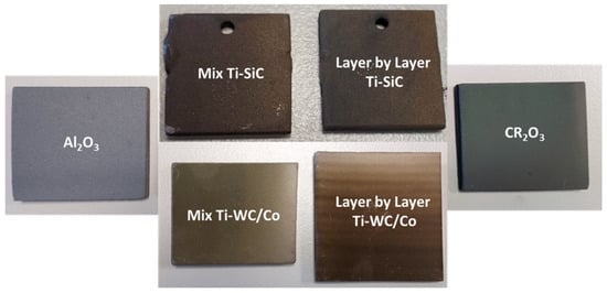 Macroscopic panoramic view of the coated specimens, including Ti-WC/Co and Ti-SiC coatings (layer-by-layer and mix deposition at 800 and 900 A) and reference Cr2O3 coatings.
