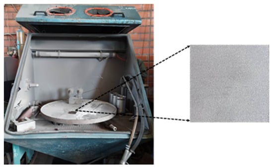 The Plasma Spray (PS) technique was utilized to coat various powders with different parameters. The substrates in all applications were steel (S235) samples (50 × 50 × 6.25 mm), which underwent sandblasting (using Al2O3), with pressure 6-8 bar and a duration of 10–15 s to ensure thorough cleaning (refer to Figure 2) and were sprayed with a NiC-Al layer to enhance the adhesion of the coatings.