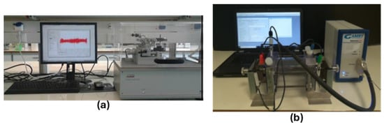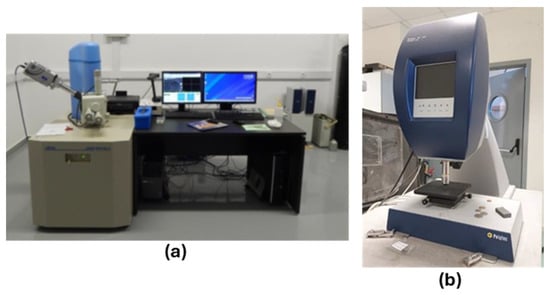 (a) Scanning Electron Microscope (SEM) JEOL 6510 LV and (b) white light profilometer (TMS-1200) by Polytec.