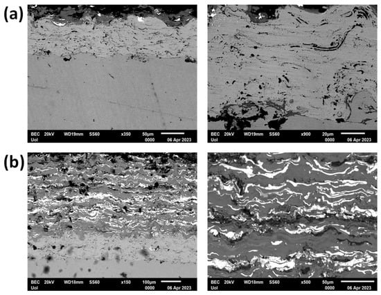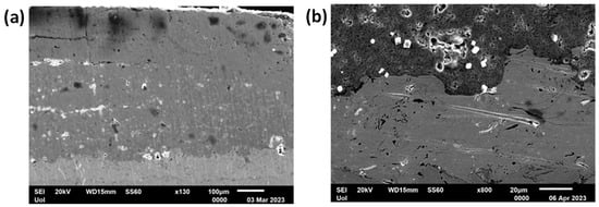 The characterization of the microstructure of the Ti-SiC coatings layer by layer at 800 A at ×350 and ×900 magnifications is illustrated in Figure 12a. The coating is observed to depict good adhesion and a relatively uniform thickness over the entire surface of the coating, but the necessary layering has not been carried out of the coating powders, which is confirmed by the overall thickness of the coating, which is quite small (measured 25–30 μm and 50–75 μm for the Ti-SiC and the Ni-Al areas, respectively). The interphase between the substrate and the coating is, in general, considerably rigid and continuous with few pores and microflaws being present. Some porosity is also evident within the coating region, which was measured to be 9–10% of the area. The characterization of the microstructure of the Ti-SiC layer coatings at 900 A at ×150 and ×500 magnifications is illustrated in Figure 12b. The coating appears to exhibit very good adhesion and a uniform thickness over the entire surface of the coating, which was measured to be around 350 µm and 100 μm for the Ti-SiC and the Ni-Al layers, respectively, while the coatings layer by layer are clearly visible over the entire surface of the coating. Some porosity and microcracking can also be observed within the coating area, measured around 9–10% coverage.