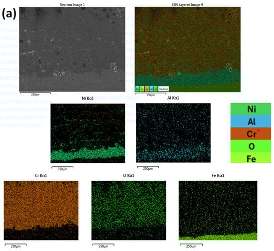 The elemental distribution of the Cr2O3 coatings was examined using EDX mapping analysis (Figure 7a,b).